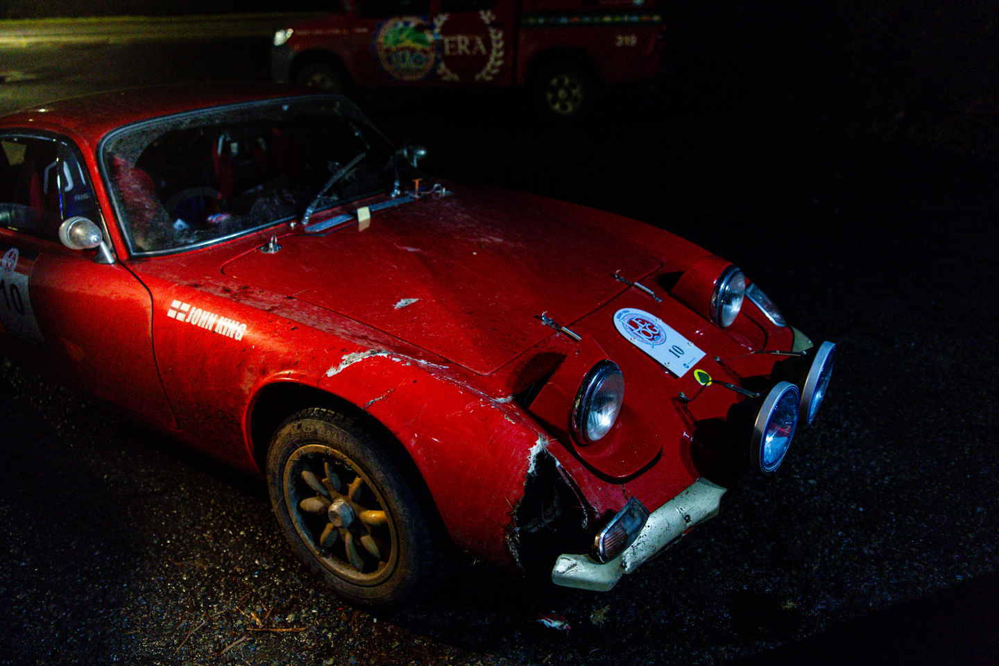 Before teams could even attempt the TC section, they had three very hard regularities to cope with, which Lotus Elan Plus Two navigator Mike Cochrane described as ‘full on, as hard as any TC section!’ The regularities proved very, very difficult with cars off in ditches, including an incident for John King with Mike in the Plus 2 as he crunched the right front after some downhill 90s got a bit too much for the Lotus. Another front running crew, Belgians Kurt Vanderspinnen and Guy Desmet had suspected water pump trouble at Crosskeys which the Sweeps were helping them with, before they went into the long night ahead. Fortunately, it was a belt issue which was fixed. Meanwhile John King was using yet another roll of tank tape to try and patch up his Lotus.