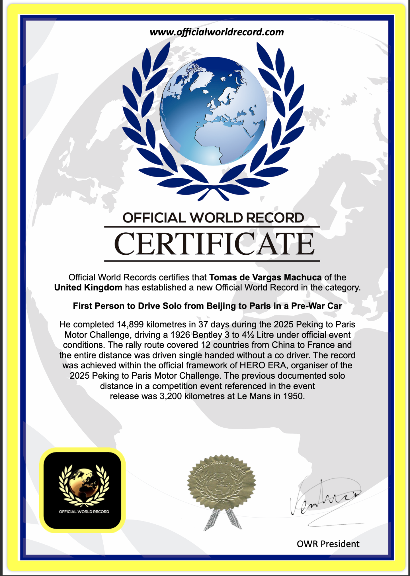 Following the application to OWR for the record breaking solo journey on the 2025 Peking to Paris Motor Challenge supported by comprehensive documentation, the International Acceptance Committee of OWR Europe informed the pioneering solo driver Tomas de Vargas Machuca, that his world record had been approved and titled by Official World Record™