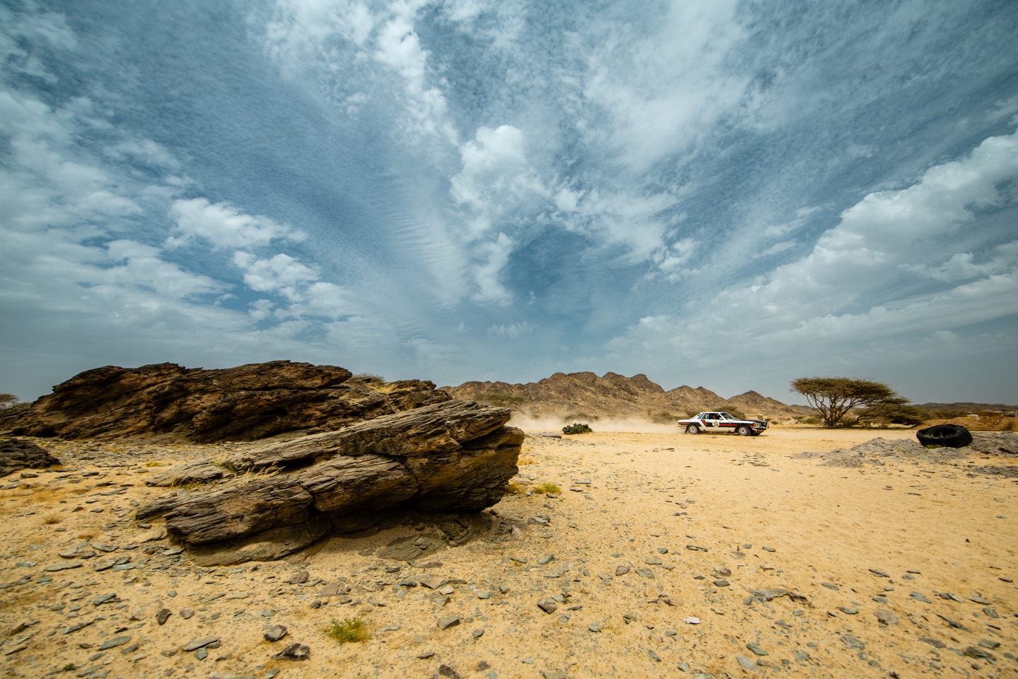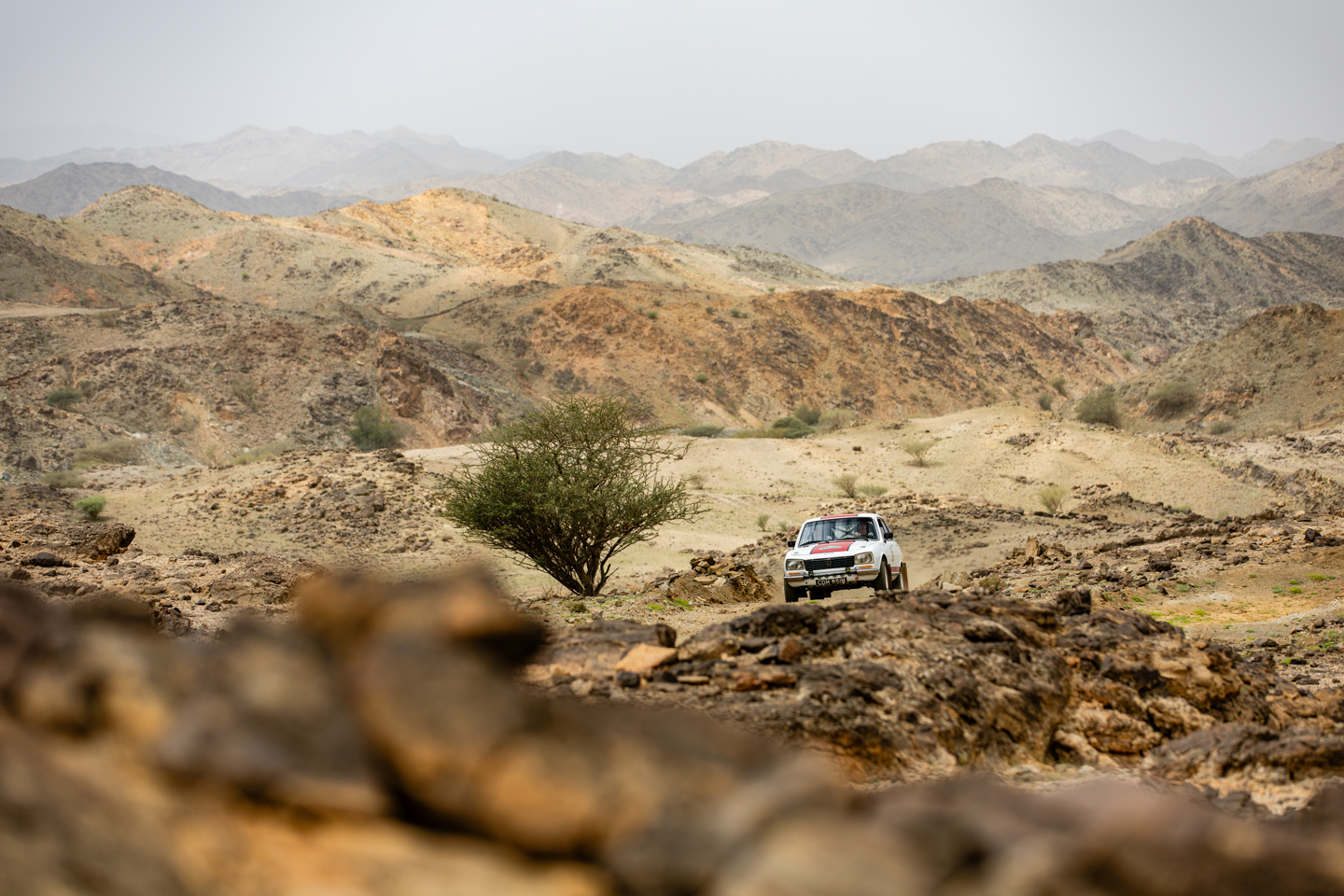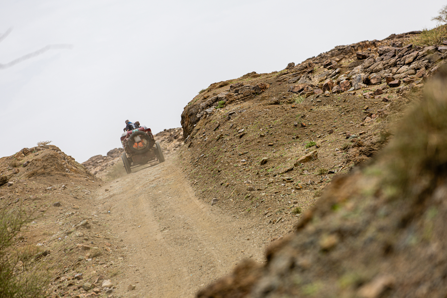 The second regularity was one of the best we enjoyed on the ’23 event, and I think the same could be said this time as well, though that sentiment may well be linked to success! The run to the reg suggested that there would be nothing remarkable about it, another dive into the rocky back lands and, with the amount of rubbish strewn across the place it was also no beauty queen. The second half of it was more picturesque, as it climbed a rock escarpment in the shadow of Jabal al Mansir, the majestic peaks towering to 5,800ft. The climbs for the cars weren’t quite touching that sort of elevation, but on the tricky mixture of sand, scree and rocks, maintaining momentum wasn’t straightforward. One constant across the reg was the number of tracks that could be followed, and these were causing consternation for the navigators, though I’m sure they would just say that their drivers were not listening to their instructions.