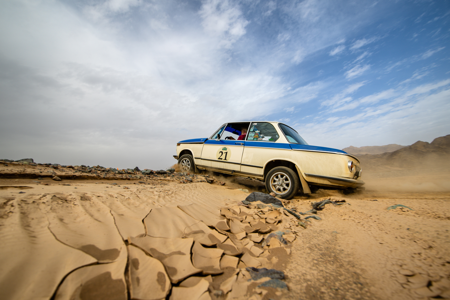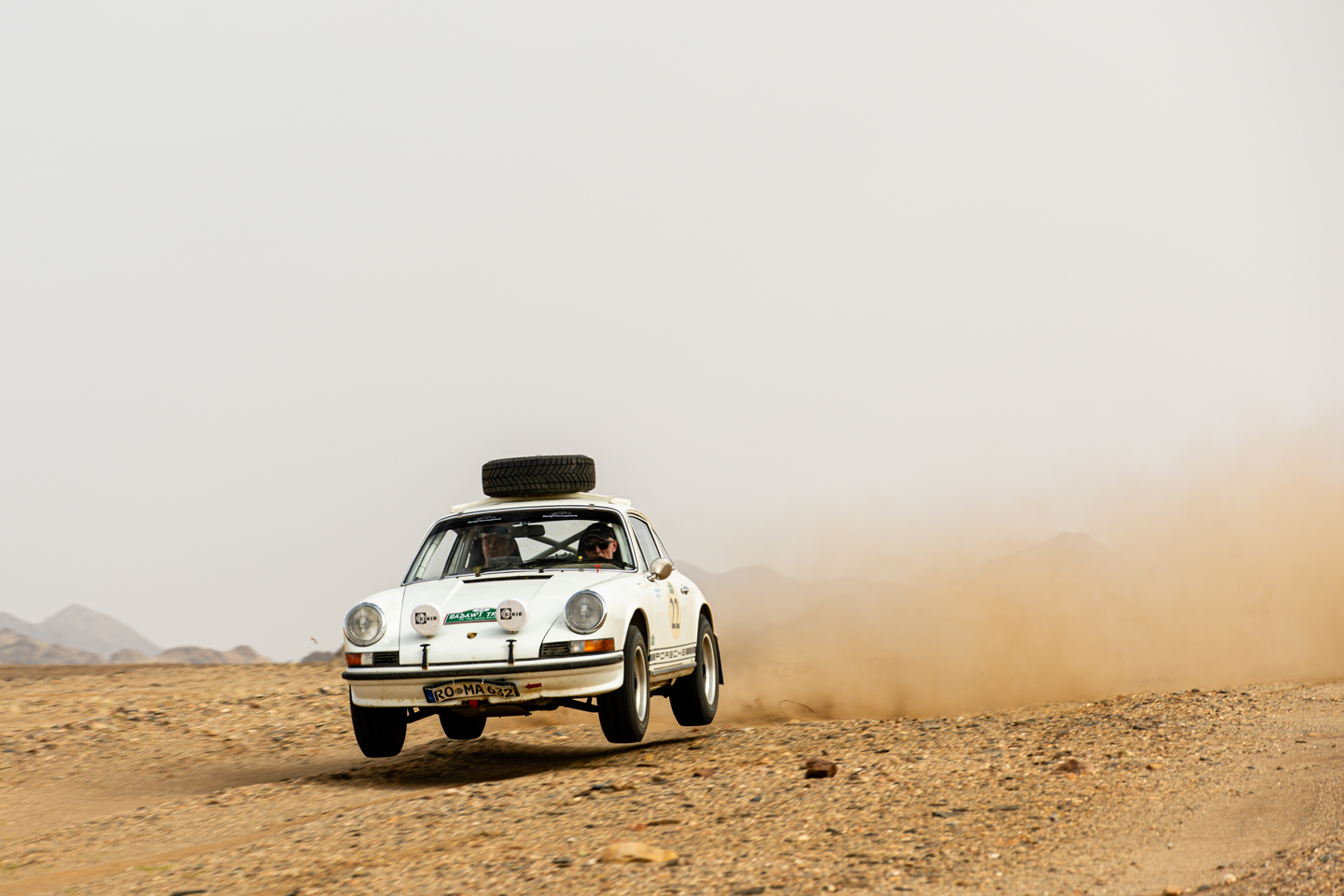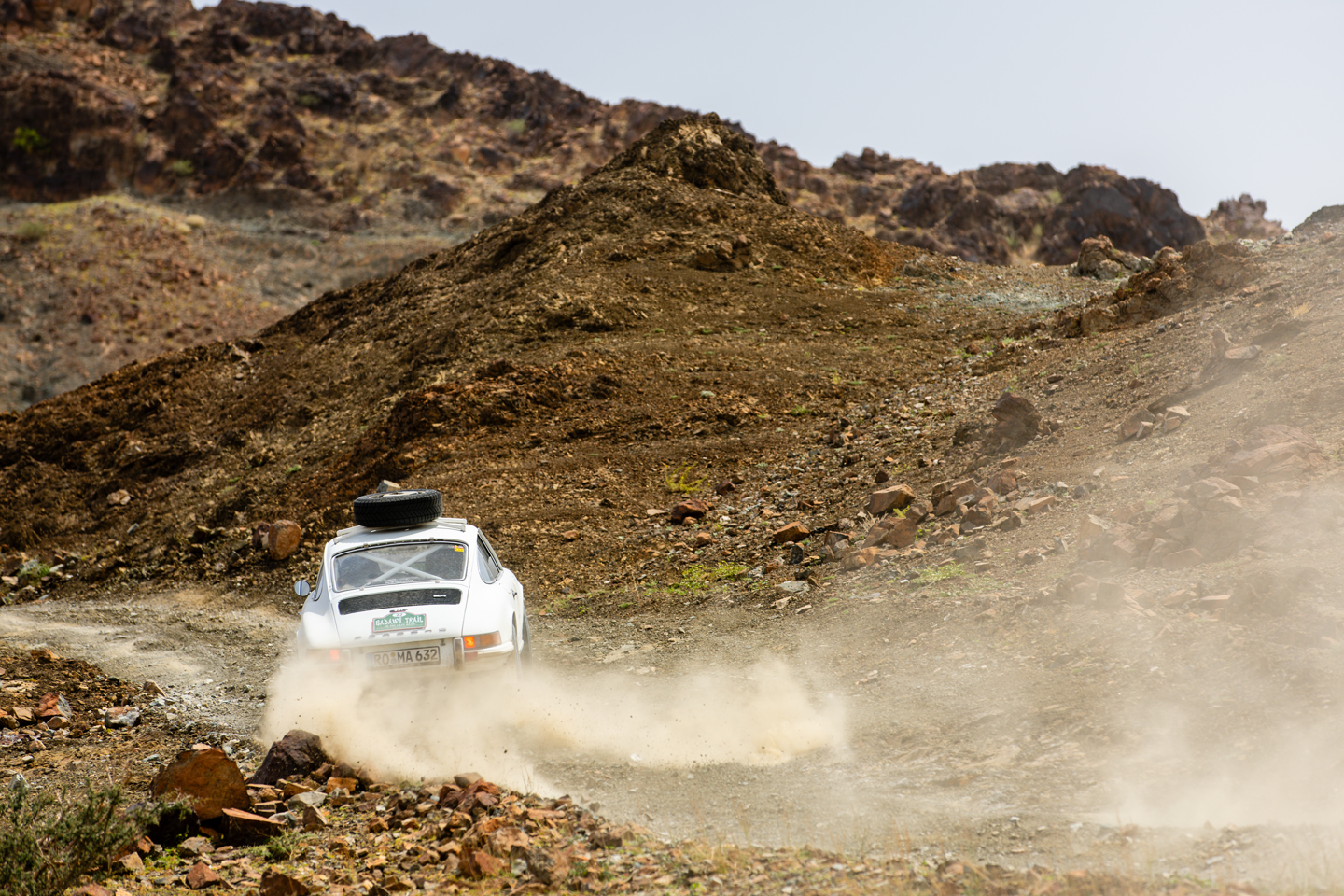 Freshly filled with coffee and delectable treats from ‘Sue’s Café’ we had our own desert battle to get on with, though this time on sand rather than rock. In fact, 18km of sand, lots of it soft, had to be traversed. The colours had changed from the morning, and the scenery was more reminiscent of a stereotypical desert, complete with herds of Camels. Golden grains of sand stretched out to the hills and mountains that soared into the distance and whilst navigationally this section was not a challenge, momentum would need to be maintained over the unpredictable drifts. Some of the more powerful cars were spectacular through here, leaping and jumping between tracks and throwing great handfuls of sand into the air. The pair of Toyota Landcruiser’s in matching liveries looked completely at home in this rally raid terrain, and Ned Bacon was also having fun in the orange 911, putting all of his Baja experience into action.