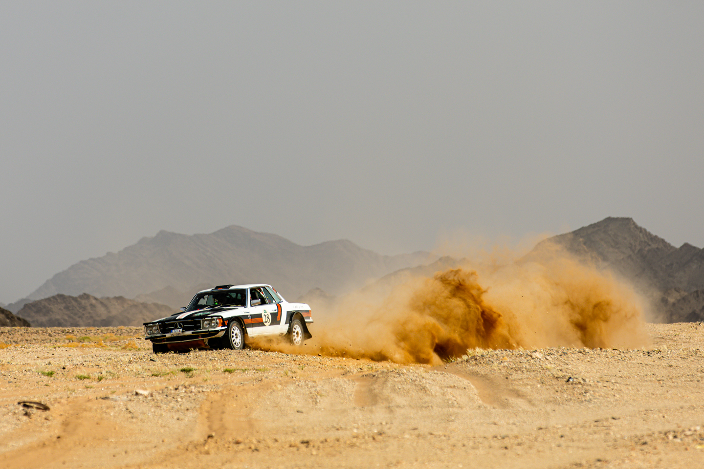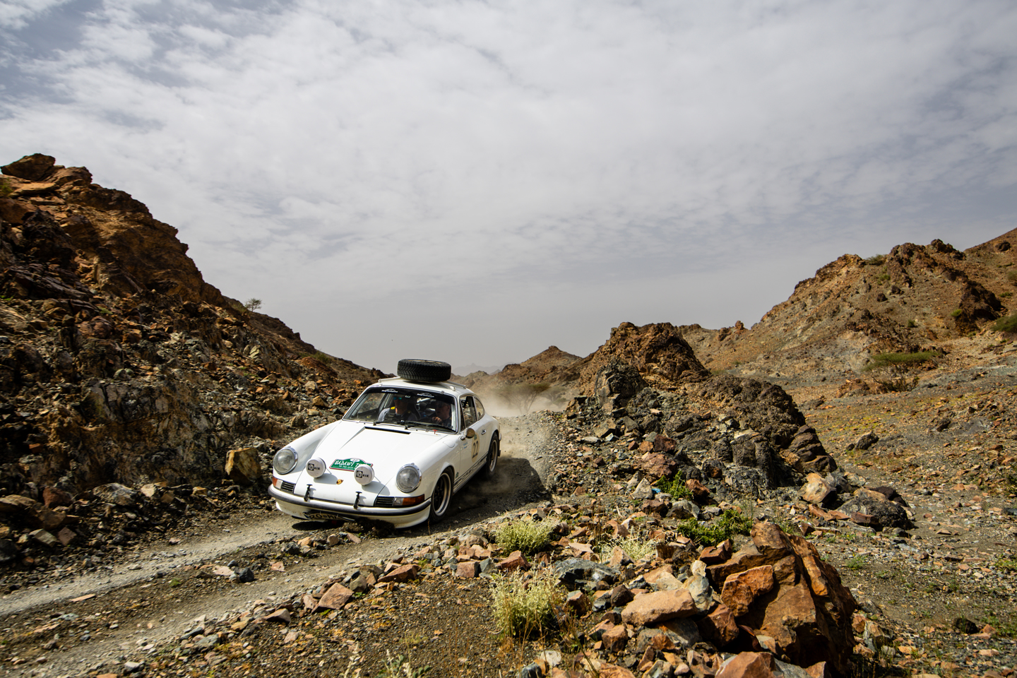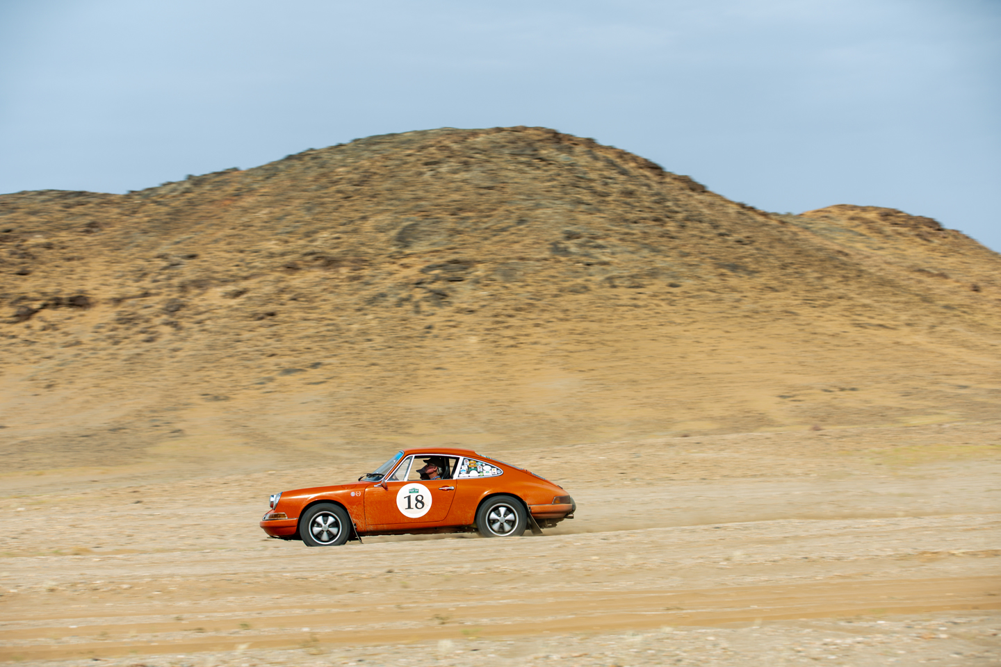 Freshly filled with coffee and delectable treats from ‘Sue’s Café’ we had our own desert battle to get on with, though this time on sand rather than rock. In fact, 18km of sand, lots of it soft, had to be traversed. The colours had changed from the morning, and the scenery was more reminiscent of a stereotypical desert, complete with herds of Camels. Golden grains of sand stretched out to the hills and mountains that soared into the distance and whilst navigationally this section was not a challenge, momentum would need to be maintained over the unpredictable drifts. Some of the more powerful cars were spectacular through here, leaping and jumping between tracks and throwing great handfuls of sand into the air. The pair of Toyota Landcruiser’s in matching liveries looked completely at home in this rally raid terrain, and Ned Bacon was also having fun in the orange 911, putting all of his Baja experience into action.