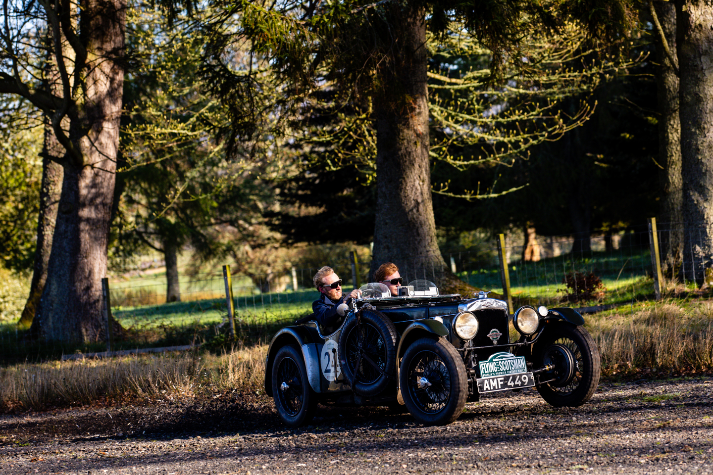 They may be Irish, but the battling Dreelan brothers are domiciled in Scotland and in fact have battled their way to their home patch of Aberdeen where they will continue the fight tomorrow, with a test even closer to home, in fact around new second place man Mike’s home tracks of his estate. Mike is being navigated by Bob Rutherford Scholarship winning young navigator Miles Fieldhouse (16) after the pair met at the HERO-ERA Awards at the Royal Automobile Club in London in January. The duo were seventh at lunch and climbed five places in their Alvis 25 to dislodge Tommy Dreelan and champion navigator Mike Cochran from second to third. This won’t be taken lightly by the Chevrolet Fangio Coupe crew who will be looking to hit back on Day Two.
